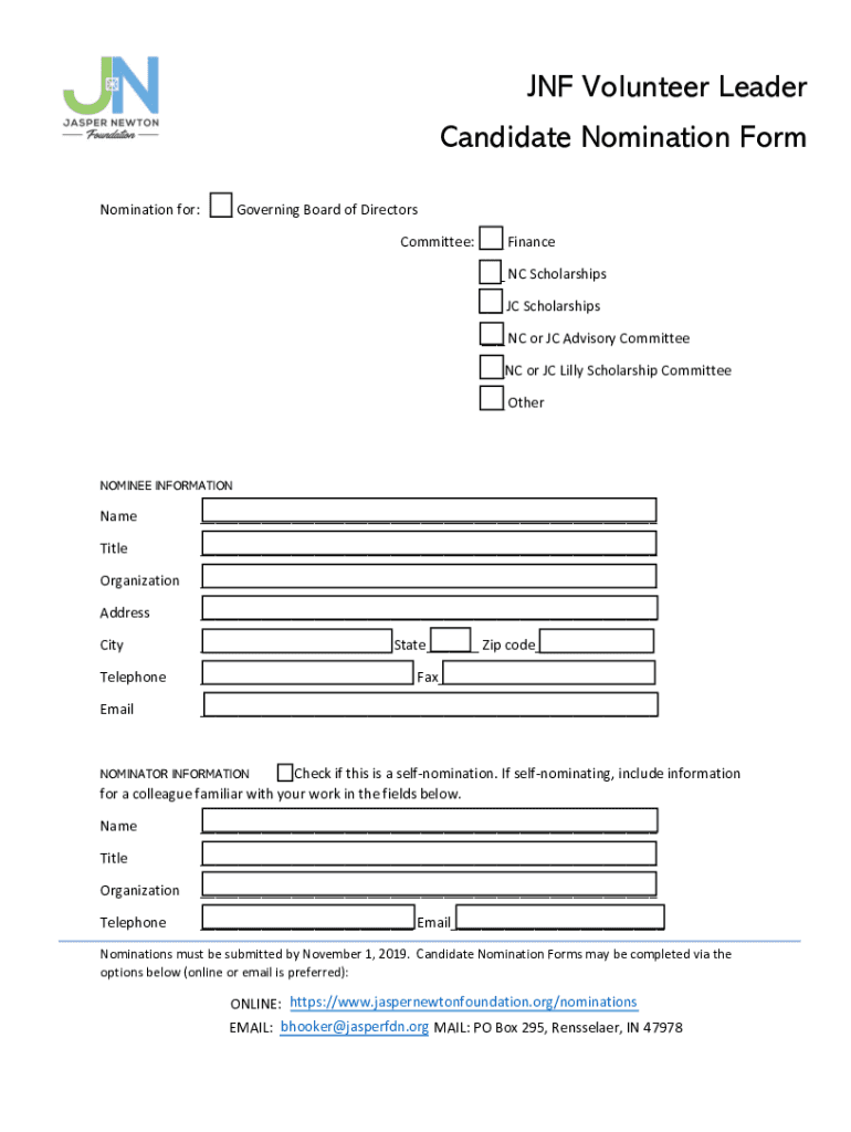 Information typically required includes the nominee's name, contact details, a description of their qualifications, and the reasons for the nomination.