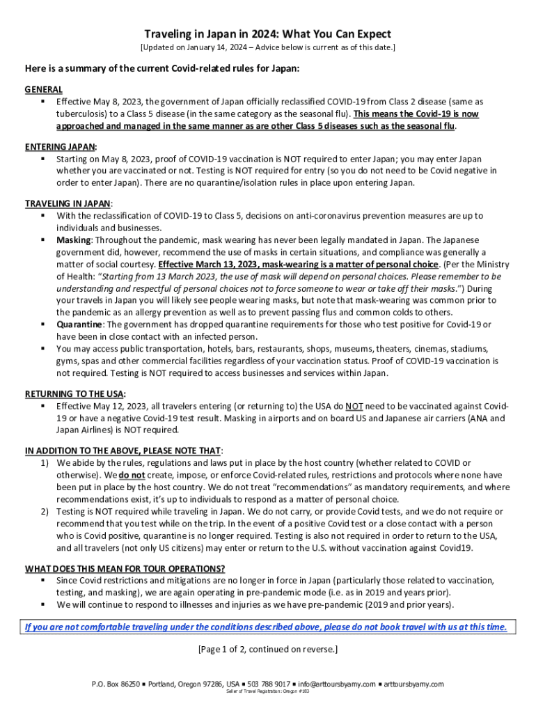 Traveling in Japan in 2024: What You Can Expect [Updated on January 14, 2024 Advice below is current as of this date.]Here is a summary of the current Covidrelated rules for Japan: GENERAL Effective