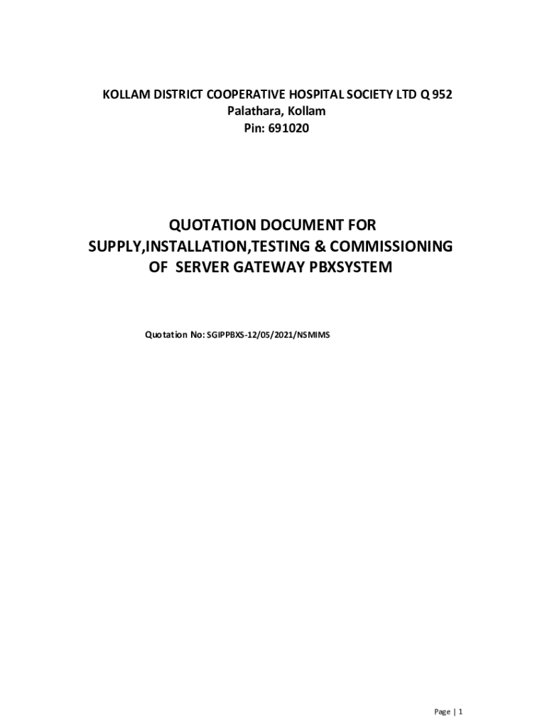 KOLLAM DISTRICT COOPERATIVE HOSPITAL SOCIETY LTD Q 952 Palathara, Kollam Pin: 691020QUOTATION DOCUMENT FOR SUPPLY,INSTALLATION,TESTING & COMMISSIONING OF SERVER GATEWAY PBXSYSTEMQuotation No: SGIPPBXS12/05/2021/NSMIMSPage
