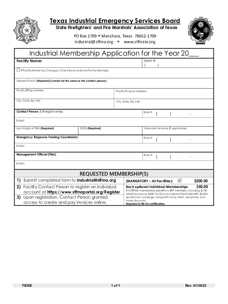 Texas Industrial Emergency Services Board State Firefighters and Fire Marshals Association of Texas POBox1709Manchaca,Texas786521709 industrial@sffma.orgwww.sffmatx.orgIndustrial Membership Application