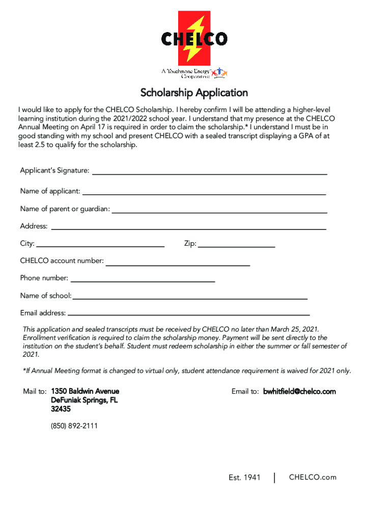 Scholarship Application I would like to apply for the CHELCO Scholarship. I hereby confirm I will be attending a higherlevel learning institution during the 2021/2022 school year. I understand that