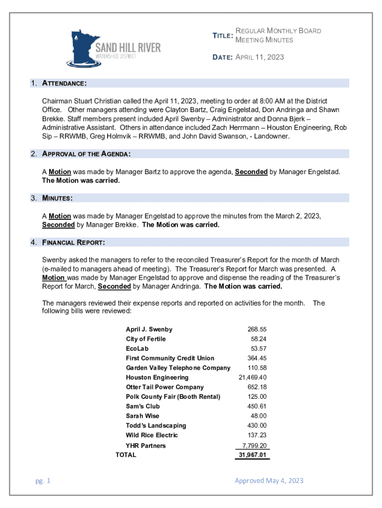 TITLE:REGULAR MONTHLY BOARD MEETING MINUTESDATE: APRIL 11, 2023 1. ATTENDANCE: Chairman Stuart Christian called the April 11, 2023, meeting to order at 8:00 AM at the District Office. Other managers