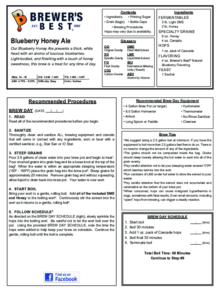 Contents Ingredients Priming Sugar Grain Bag(s) Bottle Caps Brewing Procedures Hops may vary due to availablity.Blueberry Honey AleOur Blueberry Honey Ale presents a thick, white head with an aroma