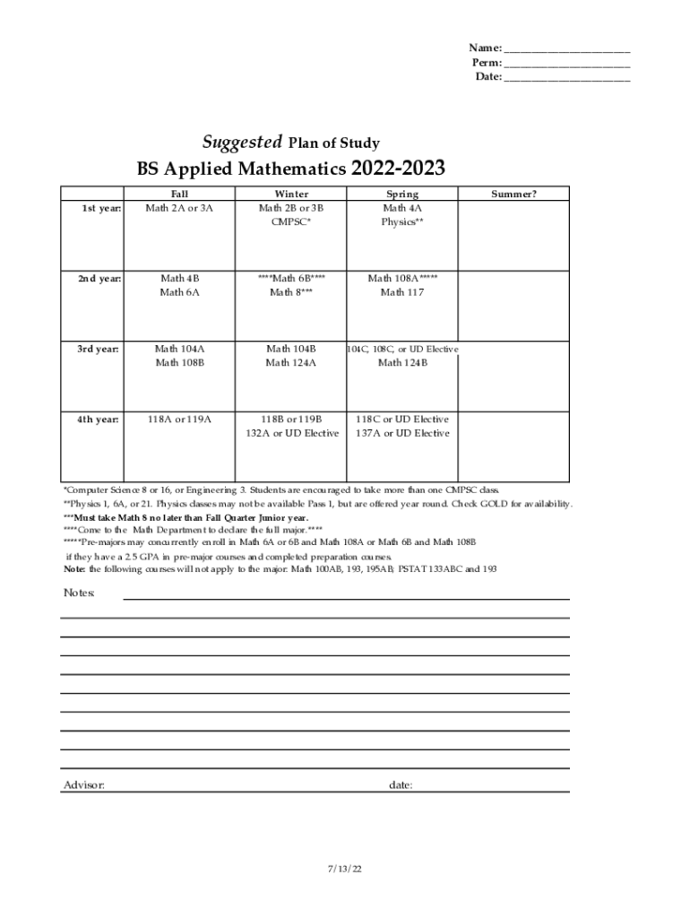 Name: ___ Perm: ___ Date: ___Suggested Plan of Study BS Applied Mathematics 20222023 Fall Math 2A or 3AWinter Math 2B or 3B CMPSC*Spring Math 4A Physics**2nd year:Math 4B Math 6A****Math 6B**** Math