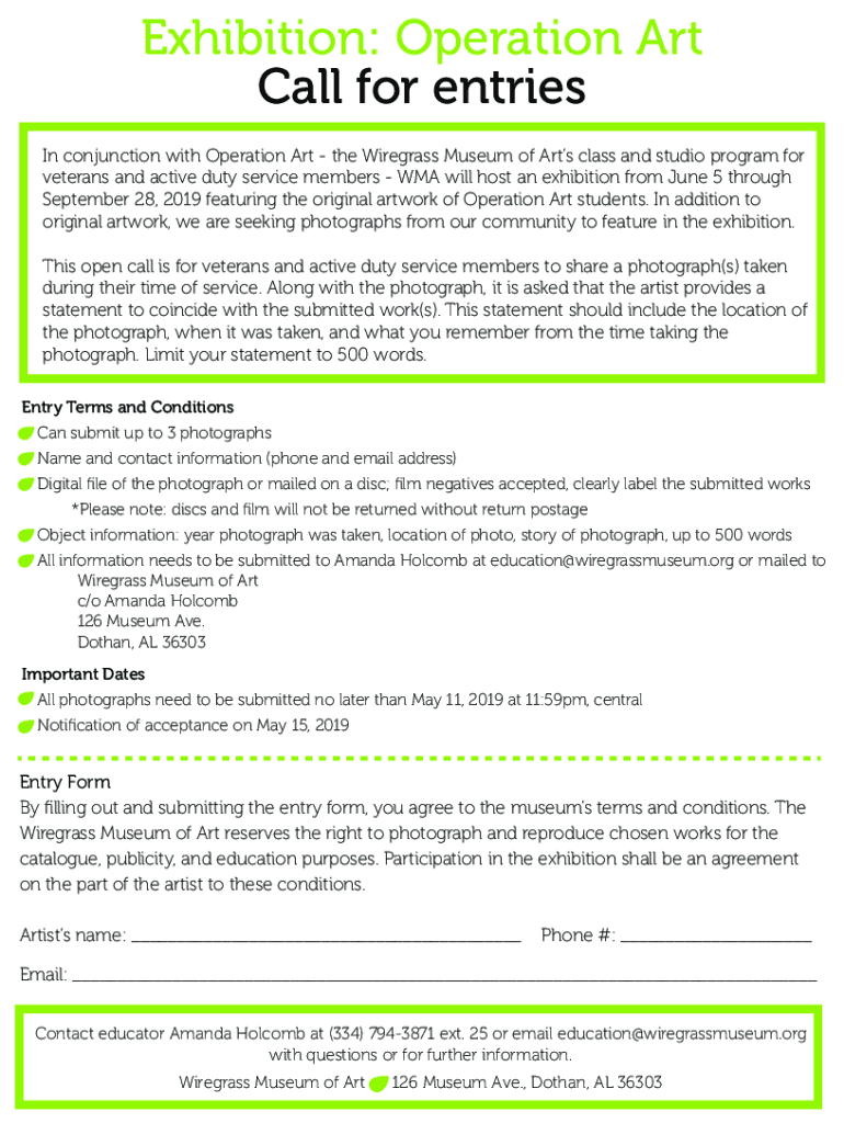 Exhibition: Operation Art Call for entries In conjunction with Operation Art the Wiregrass Museum of Arts class and studio program for veterans and active duty service members WMA will host an exhibition