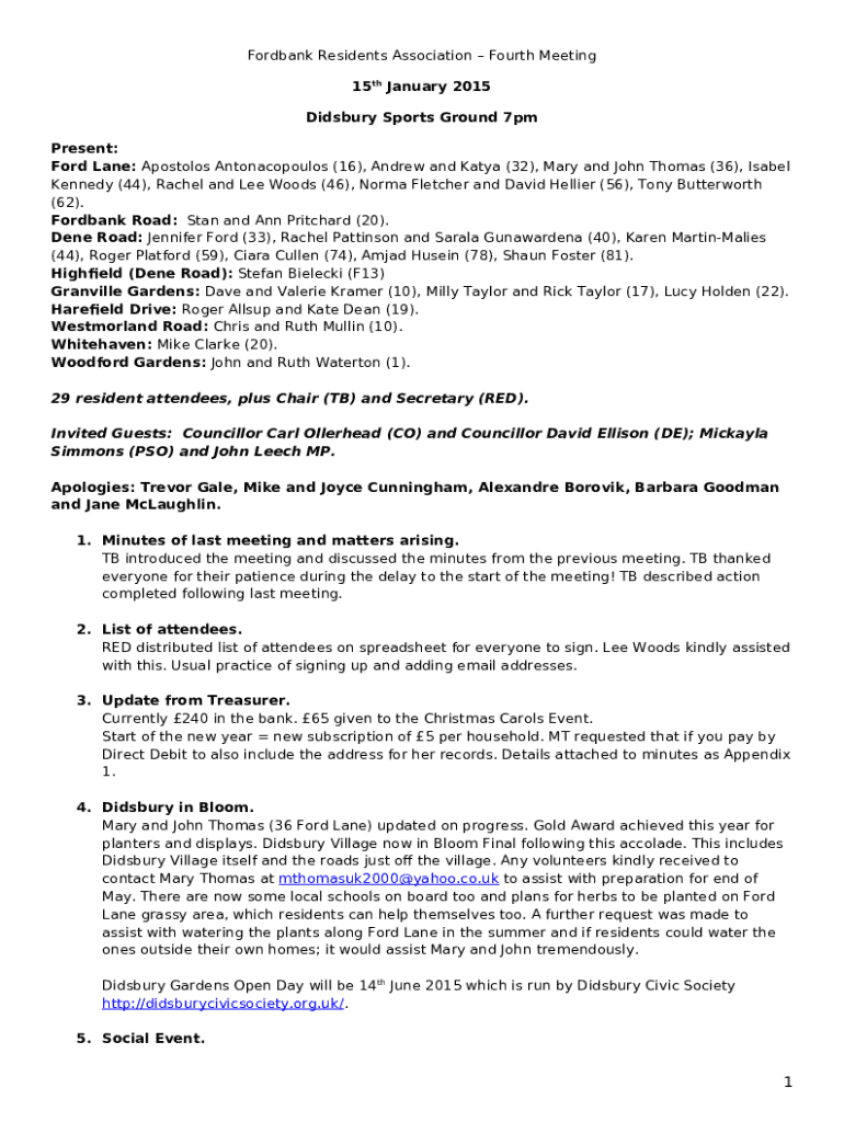 The 19 th March 2015 - Ford Bank Residents Association is a writable document that has to be completed and signed for specific reasons. Next, it is provided to the relevant addressee in order to provide certain details of certain kinds. The completion and signing can be done manually in hard copy or with an appropriate application like PDFfiller. Such services help to complete any PDF or Word file without printing out. It also allows you to edit its appearance according to your requirements and put a legal e-signature. Once you're good, you send the 19 th March 2015 - Ford Bank Residents Association to the respective recipient or several recipients by email or fax. PDFfiller has got a feature and options that make your template printable. It provides a variety of options for printing out. It does no matter how you'll deliver a form - physically or by email - it will always look neat and organized. To not to create a new document from the beginning every time, make the original document as a template. Later, you will have an editable sample.