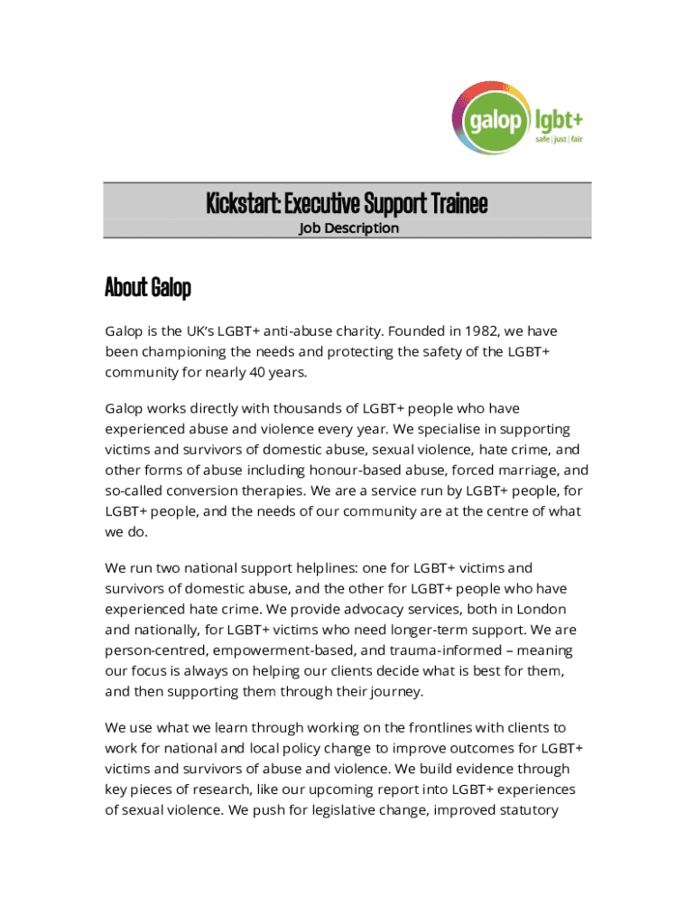 Kickstart: Executive Support Trainee Job DescriptionAbout Galop Galop is the UKs LGBT+ antiabuse charity. Founded in 1982, we have been championing the needs and protecting the safety of the LGBT+