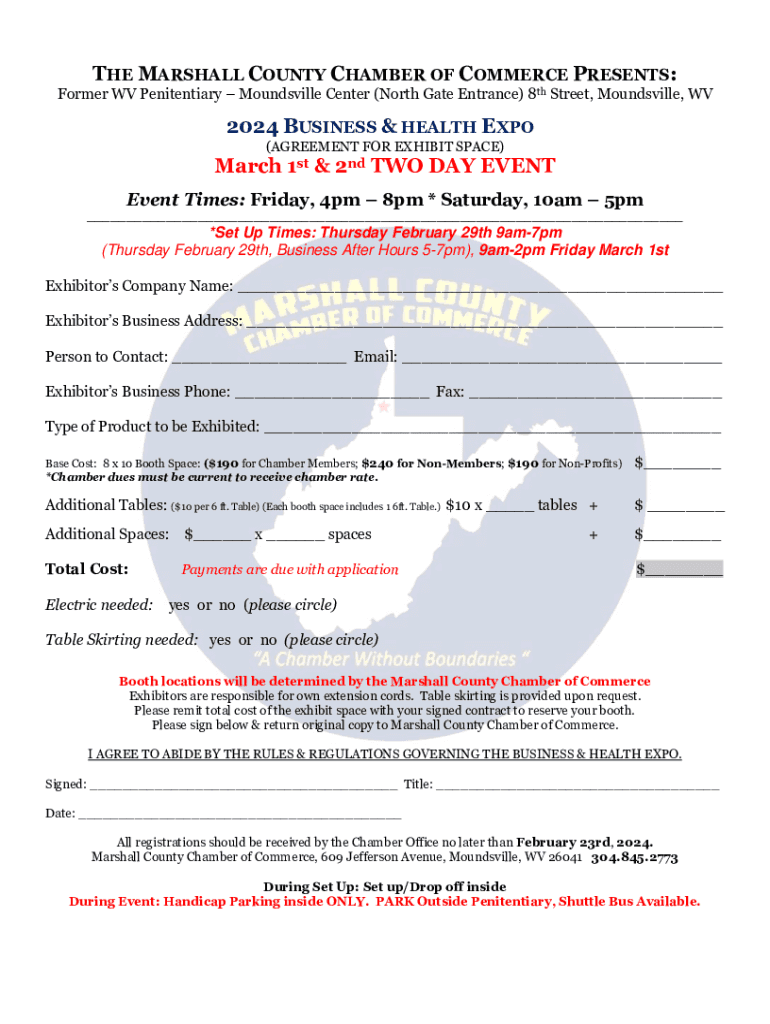 THE MARSHALL COUNTY CHAMBER OF COMMERCE PRESENTS: Former WV Penitentiary Moundsville Center (North Gate Entrance) 8th Street, Moundsville, WV2024 BUSINESS & HEALTH EXPO(AGREEMENT FOR EXHIBIT SPACE)