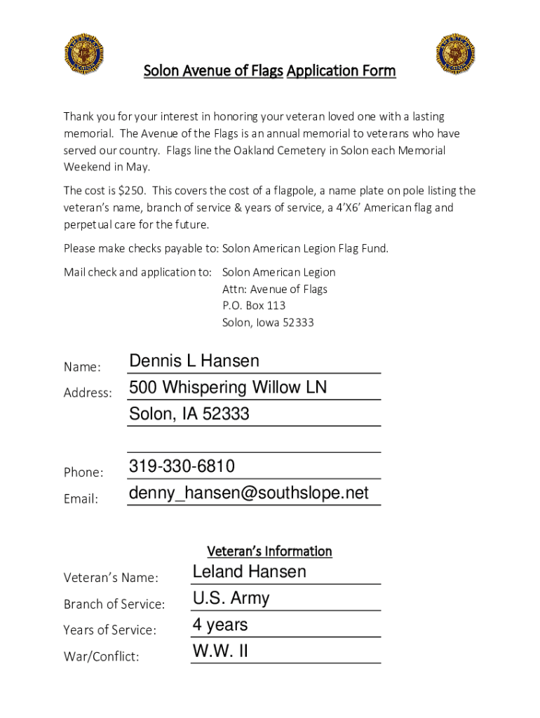 Solon Avenue of Flags Application Form Thank you for your interest in honoring your veteran loved one with a lasting memorial. The Avenue of the Flags is an annual memorial to veterans who have served
