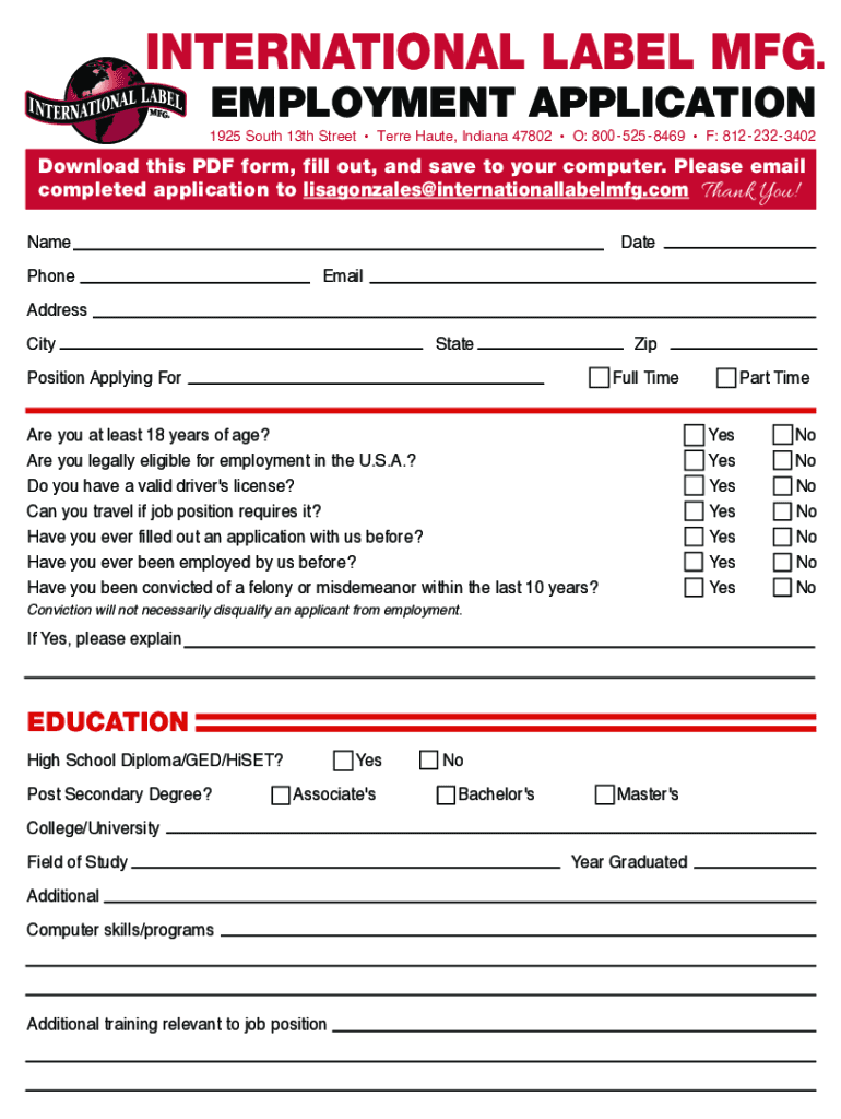 INTERNATIONAL LABEL MFG. EMPLOYMENT APPLICATION1925 South 13th Street Terre Haute, Indiana 47802 O: 8005258469 F: 812 2323402Download this PDF form, fill out, and save to your computer. Please email