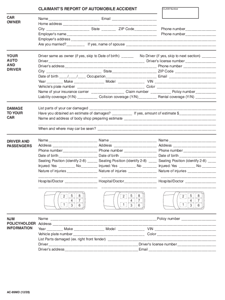 CLAIMANT\'S REPORT OF AUTOMOBILE ACCIDENTCLAIM NumberCAR OWNERName___ Email___ Home address___ City___ State ___ ZIP Code___ Phone number___ Employer\'s name___ Phone number___ Employer\'s address___