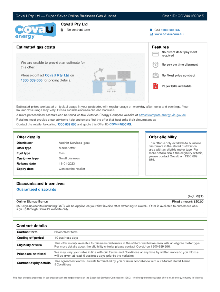 CovaU Pty Ltd Super Saver Online Business Gas AusnetOffer ID: COV441600MSCovaU Pty Ltd No contract termCall 1300 689 866 www.covau.com.auEstimated gas costsFeatures No direct debit payment requiredWe