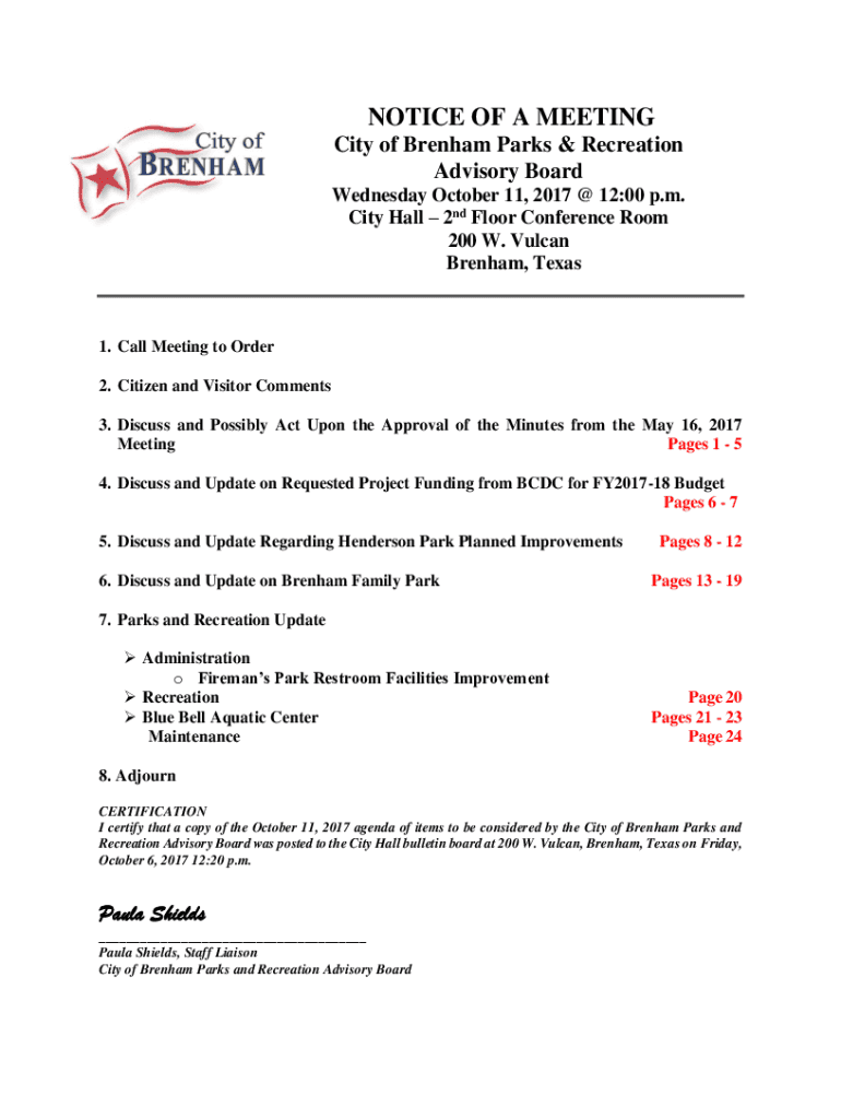 NOTICE OF A MEETING City of Brenham Parks & Recreation Advisory Board Wednesday October 11, 2017 @ 12:00 p.m. City Hall 2nd Floor Conference Room 200 W. Vulcan Brenham, Texas1. Call Meeting to Order