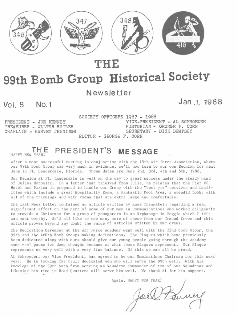 ..,, ( p ,,4H.i .THE 99th Bomb Group Historical Society N ewsJetterVol. 8No.1PRESIDENT J OE KENNEY TREASURER \'NALTER BUTLER CHAPLAIN HARVEY JENIHNGSJan .1, 1988S OCIETY OFFICERS 1987 1988 VICEPRESIDENT