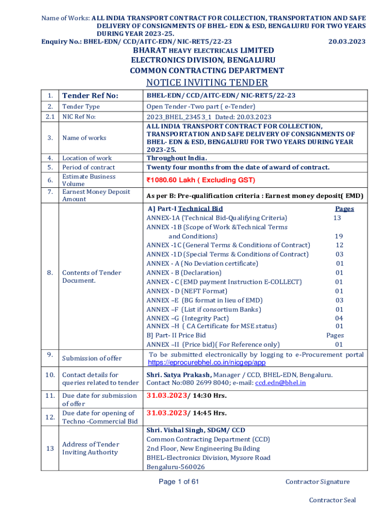 Name of Works: ALL INDIA TRANSPORT CONTRACT FOR COLLECTION, TRANSPORTATION AND SAFE DELIVERY OF CONSIGNMENTS OF BHEL EDN & ESD, BENGALURU FOR TWO YEARS DURING YEAR 202325. Enquiry No.: BHELEDN/ CCD/AITCEDN/