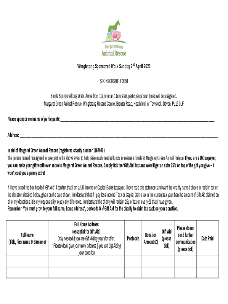 Wingletang Sponsored Walk Sunday 2nd April 2023 SPONSORSHIP FORM 6 mile Sponsored Dog Walk. Arrive from 10am for an 11am start, participants start times will be staggered. Margaret Green Animal Rescue,