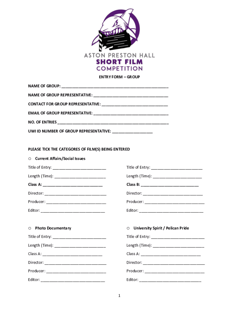 ENTRY FORM GROUP NAME OF GROUP: ___ NAME OF GROUP REPRESENTATIVE: ___ CONTACT FOR GROUP REPRESENTATIVE: ___ EMAIL OF GROUP REPRESENTATIVE: ___ NO. OF ENTRIES ___ UWI ID NUMBER OF GROUP REPRESENTATIVE: