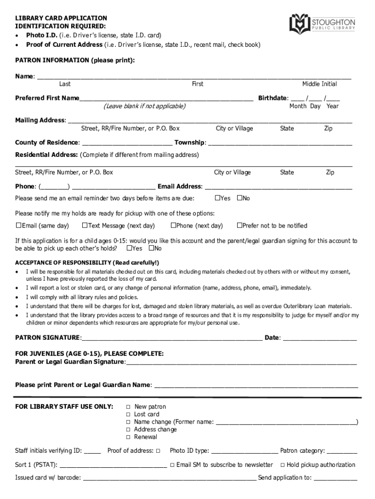 LIBRARY CARD APPLICATION IDENTIFICATION REQUIRED: Photo I.D. (i.e. Drivers license, state I.D. card) Proof of Current Address (i.e. Drivers license, state I.D., recent mail, check book) PATRON INFORMATION