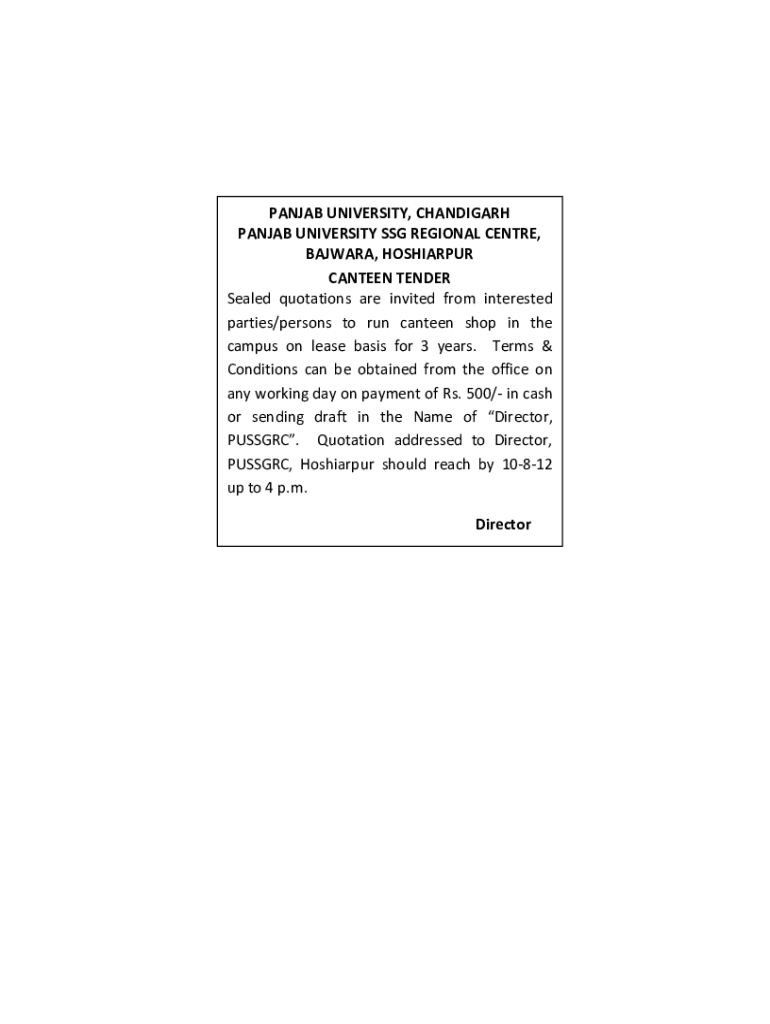 PANJAB UNIVERSITY, CHANDIGARH PANJAB UNIVERSITY SSG REGIONAL CENTRE, BAJWARA, HOSHIARPUR CANTEEN TENDER Sealed quotations are invited from interested parties/persons to run canteen shop in the campus