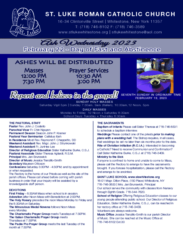 S T. L U K E R O M A N C AT H O L I C C H U R C H 1634 Clintonville Street | Whitestone, New York 11357 T: (718) 7468102 F: (718) 7463589 www.stlukewhitestone.org | stlukewhitestone@aol.comSixth Sunday