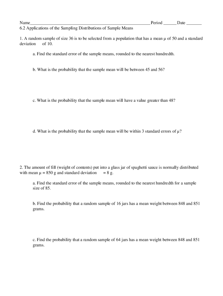 Name___ Period ___ Date ___ 6.2 Applications of the Sampling Distributions of Sample Means 1. A random sample of size 36 is to be selected from a population that has a mean of 50 and a standard deviation