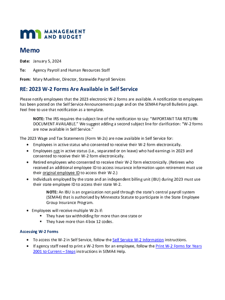 Memo Date: January 5, 2024 To:Agency Payroll and Human Resources StaffFrom: Mary Muellner, Director, Statewide Payroll ServicesRE: 2023 W2 Forms Are Available in Self Service Please notify employees