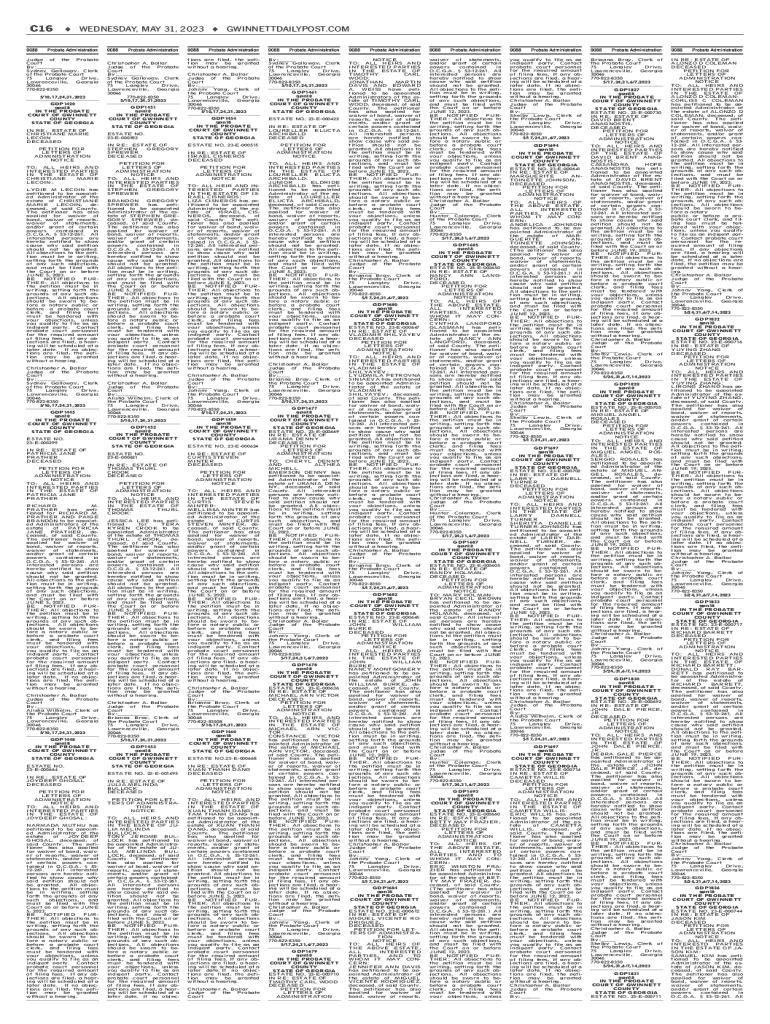 C16 WEDNESDAY, MAY 31, 2023 GWINNETTDAILYPOST.COM Judge of the Probate Court By:___ Sydney Galloway, Clerk of the Probate Court 75 Langley Drive, Lawrenceville, Georgia 30046 7708228350 5/10,17,24,31,2023
