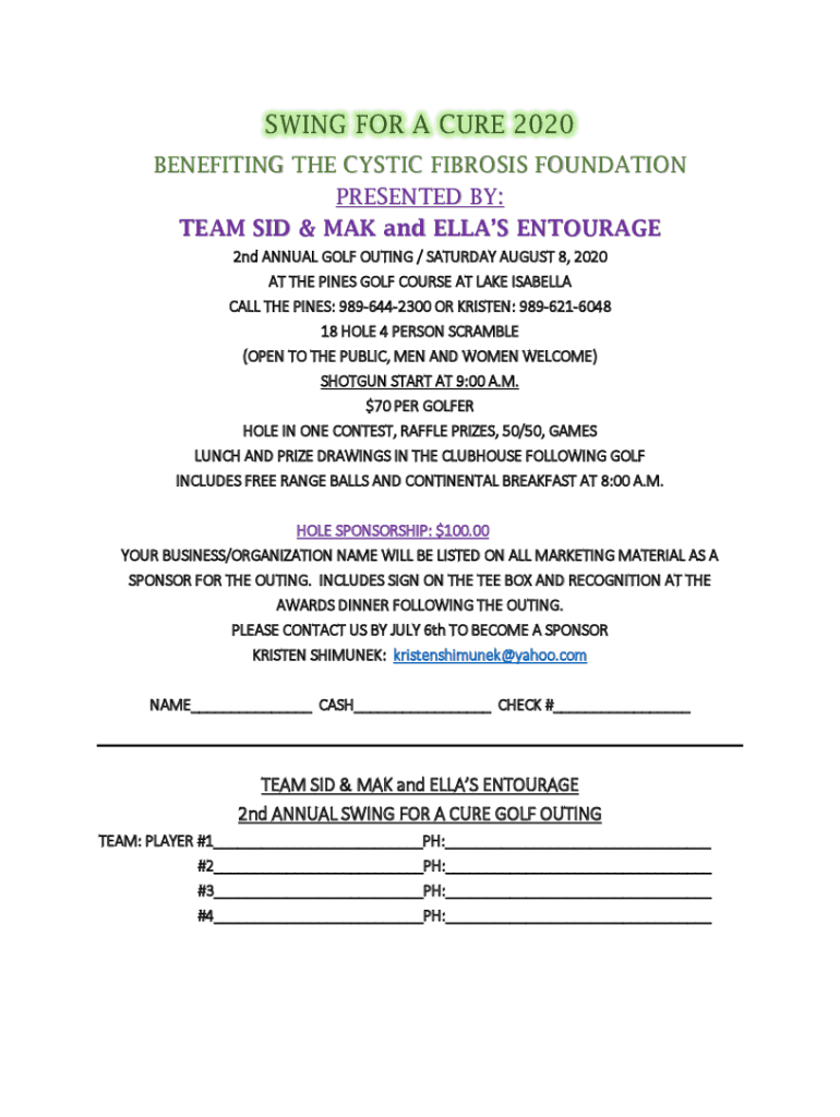 SWING FOR A CURE 2020 BENEFITING THE CYSTIC FIBROSIS FOUNDATION PRESENTED BY: TEAM SID & MAK and ELLIS ENTOURAGE 2nd ANNUAL GOLF OUTING / SATURDAY, AUGUST 8, 2020, AT THE PINES GOLF COURSE AT LAKE