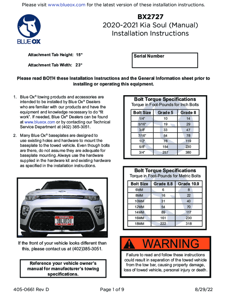 Please visit www.blueox.com for the latest version of these installation instructions.BX2727 20202021 Kia Soul (Manual) Installation Instructions Attachment Tab Height: 15Serial NumberAttachment Tab