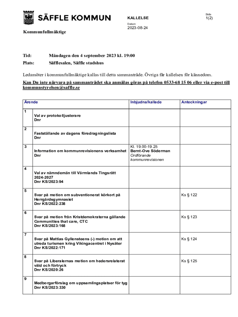 Sida1(2)KALLELSE DatumKommunfullmktige20230824Tid:Mndagen den 4 september 2023 kl. 19:00Plats:Sfflesalen, Sffle stadshusLedamter i kommunfullmktige kallas till detta sammantrde. vriga fr kallelsen