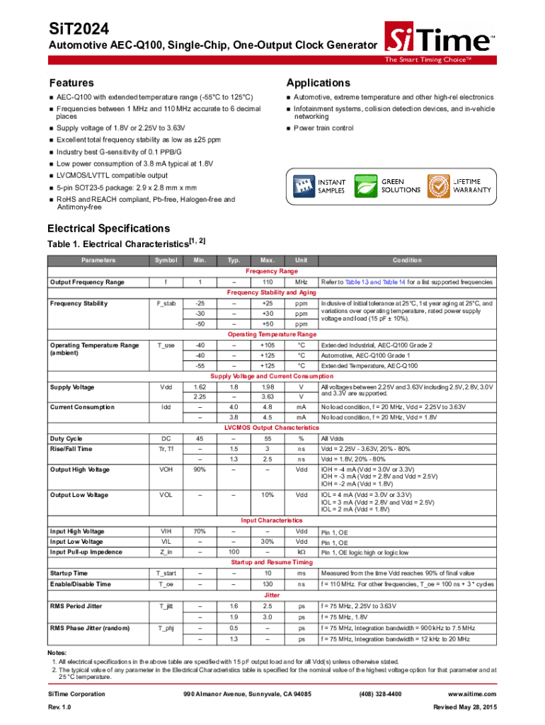 SiT2024 Automotive AECQ100, SingleChip, OneOutput Clock Generator The Smart Timing Choice The Smart Timing Choice ,FeaturesApplicationsAECQ100 with extended temperature range (55C to 125C)Automotive,