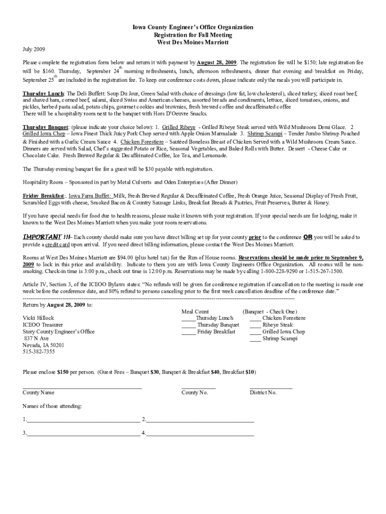Iowa County Engineers Office Organization Registration for Fall Meeting West Des Moines Marriott July 2009 Please complete the registration form below and return it with payment by August 28, 2009.