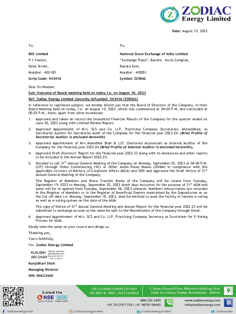 Date: August 10, 2023To,To,BSE LimitedNational Stock Exchange of India LimitedP J Towers,Exchange Plaza, Bandra Kurla Complex,Dalal Street,Bandra East,Mumbai 400 001Mumbai 400051Scrip Code: 543416Symbol: