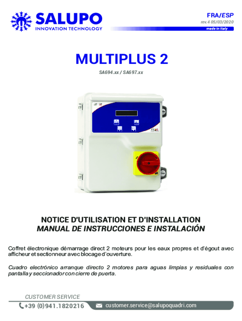 FRA/ESP rev.4 05/03/2020MULTIPLUS 2 SA694.xx / SA697.xxNOTICE D\'UTILISATION ET D\'INSTALLATION MANUAL DE INSTRUCCIONES E INSTALACIN Coffret lectronique dmarrage direct 2 moteurs pour les eaux propres