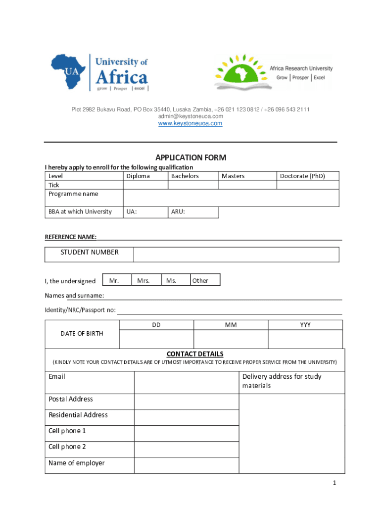 Plot 2982 Bukavu Road, PO Box 35440, Lusaka Zambia, +26 021 123 0812 / +26 096 543 2111 admin@keystoneuoa.comwww.keystoneuoa.comAPPLICATION FORM I hereby apply to enroll for the following qualification