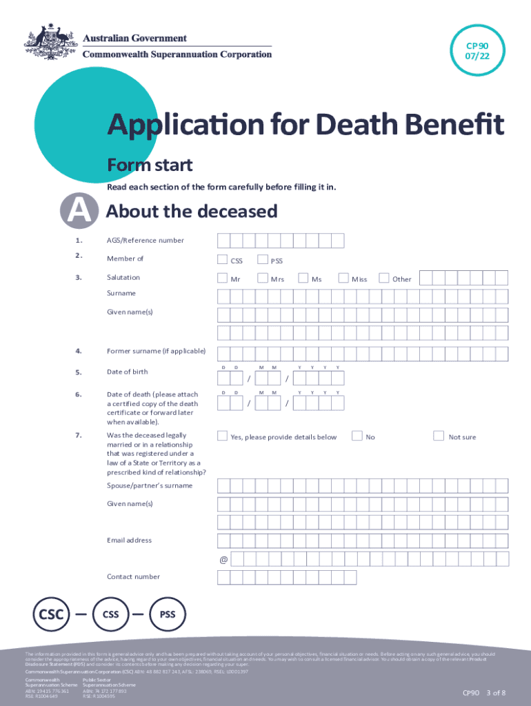 CP90 07/22Application for Death BenefitImportant information about this form Before you use this formBefore completing this benefit application form, it is recommended that you read the Product Disclosure
