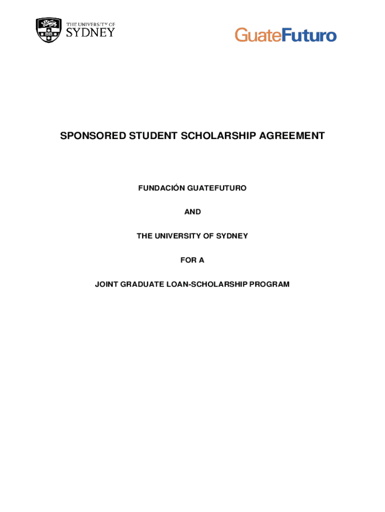 SPONSORED STUDENT SCHOLARSHIP AGREEMENTFUNDACIN GUATEFUTURO AND THE UNIVERSITY OF SYDNEY FOR A JOINT GRADUATE LOANSCHOLARSHIP PROGRAMPARTIES FUNDACIN GUATEFUTURO, Blvd. Los Prceres Zona Pradera Torre