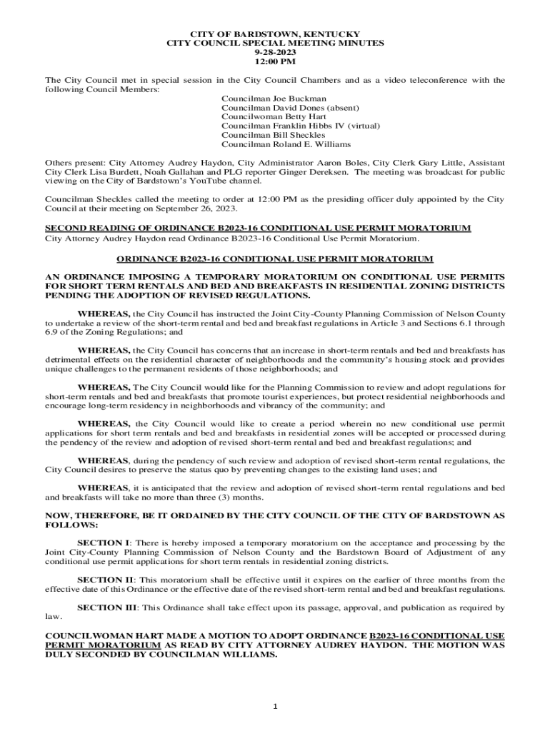 CITY OF BARDSTOWN, KENTUCKY CITY COUNCIL SPECIAL MEETING MINUTES 9282023 12:00 PM The City Council met in special session in the City Council Chambers and as a video teleconference with the following