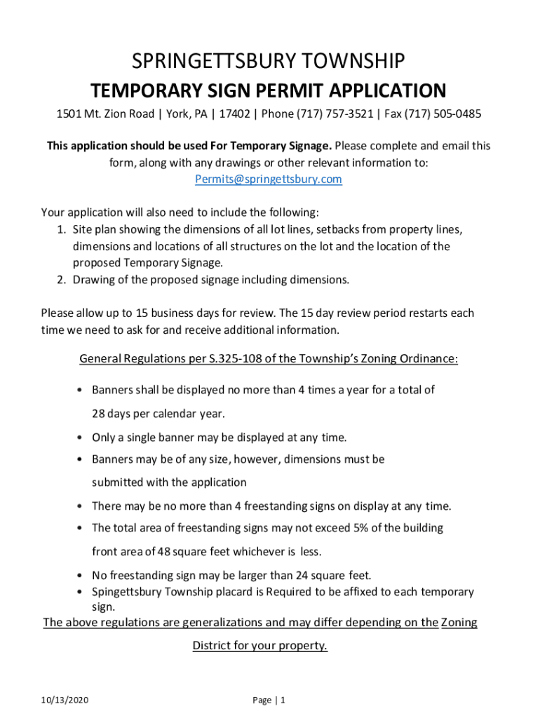 SPRINGETTSBURY TOWNSHIP TEMPORARY SIGN PERMIT APPLICATION 1501 Mt. Zion Road | York, PA | 17402 | Phone (717) 7573521 | Fax (717) 5050485 This application should be used For Temporary Signage. Please