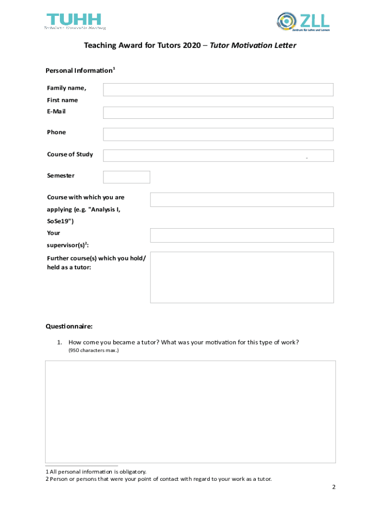 Teaching Award for Tutors 2020 Tutor Motivation Letter Information Page Please read the following important notes: 1. How should the questionnaire be completed? The Teaching Award for Tutors is presented