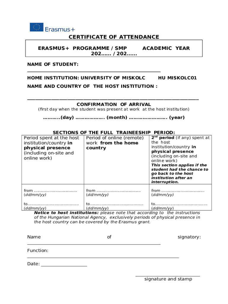What is certificate of attendance erasmus+ programme / smp ... Form?