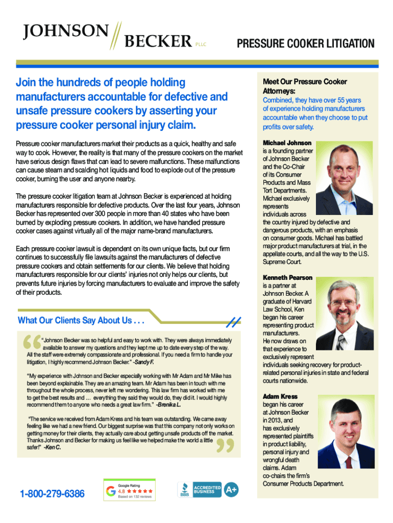PRESSURE COOKER LITIGATION Join the hundreds of people holding manufacturers accountable for defective and unsafe pressure cookers by asserting your pressure cooker personal injury claim.Meet Our