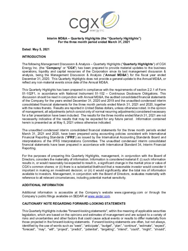 Interim MD&A Quarterly Highlights (the Quarterly Highlights) For the three month period ended March 31, 2021 Dated: May 5, 2021 INTRODUCTION The following Management Discussion & Analysis Quarterly