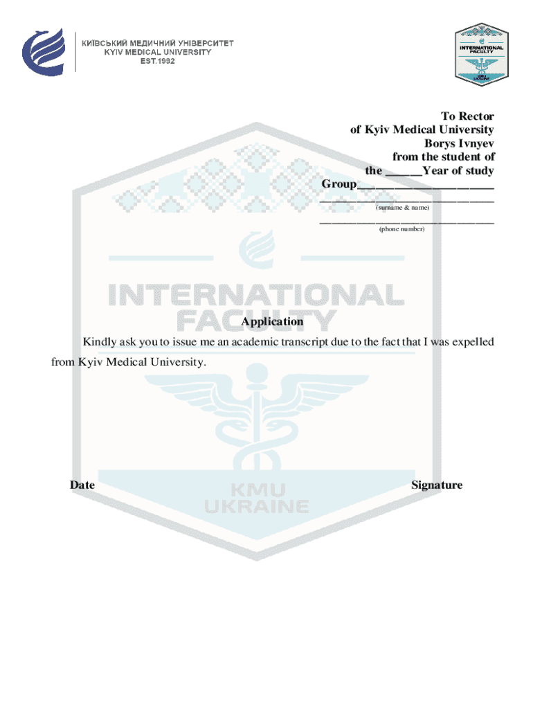 To Rector of Kyiv Medical University Borys Ivnyev from the student of the ___Year of study Group___ ___ (surname & name)___ (phone number)Application Kindly ask you to issue me an academic transcript