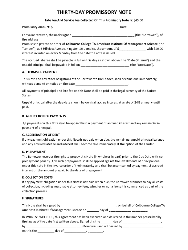 THIRTYDAY PROMISSORY NOTE Late Fee And Service Fee Collected On This Promissory Note Is: $45.00 Promissory Amount: $Date:For value received, the undersigned ___ (the Borrower), of the address ___