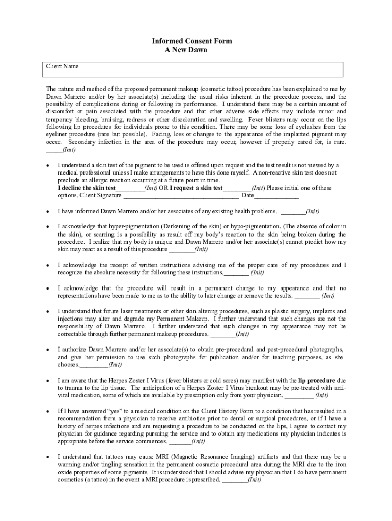 Informed Consent Form A New Dawn Client Name The nature and method of the proposed permanent makeup (cosmetic tattoo) procedure has been explained to me by Dawn Marrero and/or by her associate(s)