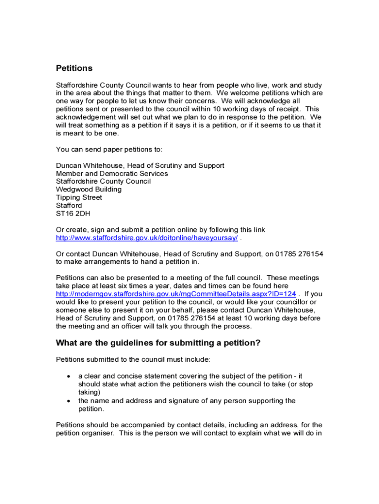 Petitions Staffordshire County Council wants to hear from people who live, work and study in the area about the things that matter to them. We welcome petitions which are one way for people to let
