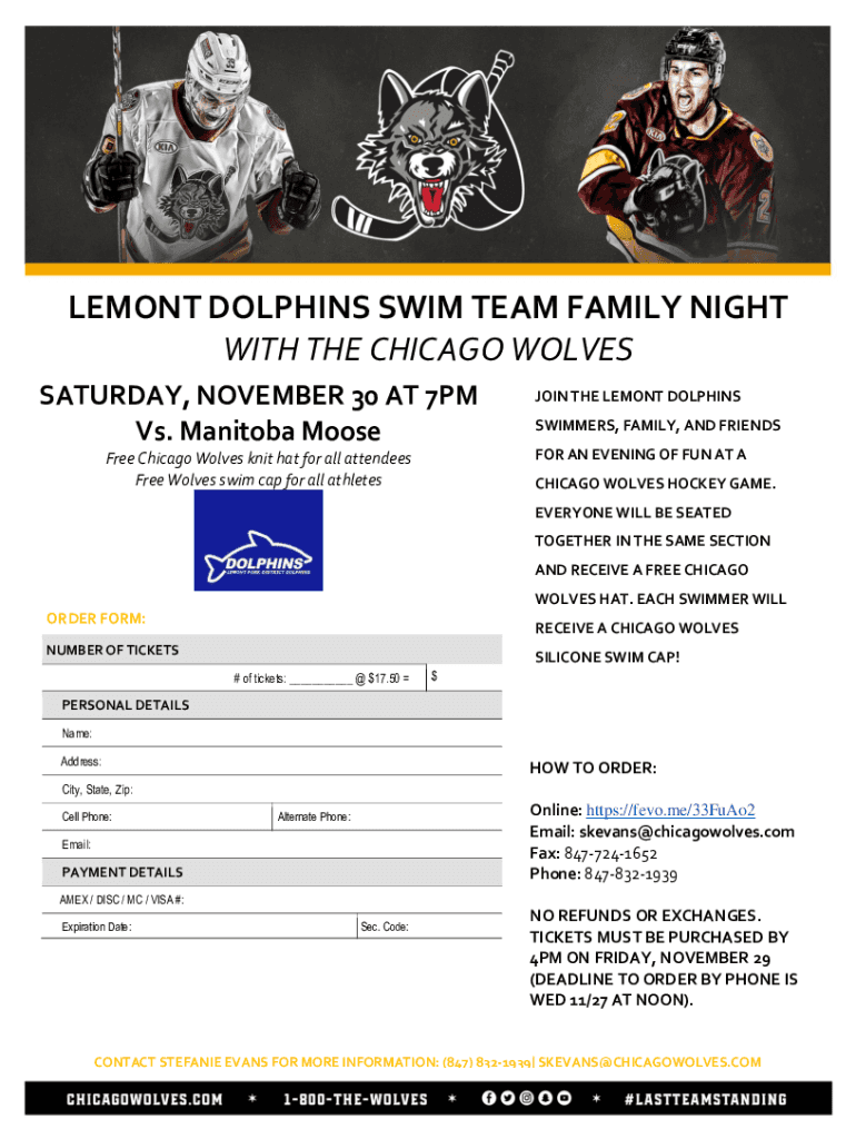 LEMONT DOLPHINS SWIM TEAM FAMILY NIGHT WITH THE CHICAGO WOLVES SATURDAY, NOVEMBER 30 AT 7PM Vs. Manitoba Moose Free Chicago Wolves knit hat for all attendees Free Wolves swim cap for all athletesJOIN