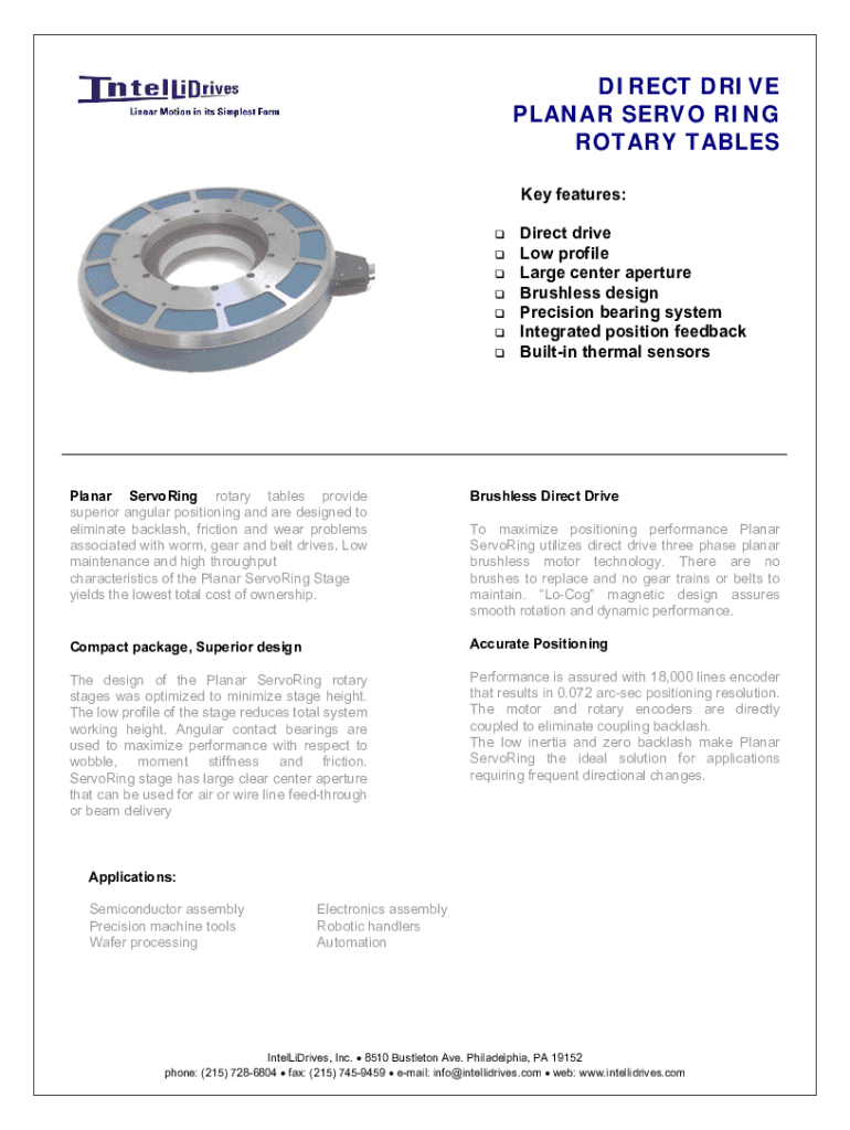 DIRECT DRIVE PLANAR SERVO RING ROTARY TABLES Key features: Direct drive Low profile Large center aperture Brushless design Precision bearing system Integrated position feedback Builtin thermal sensorsPlanar