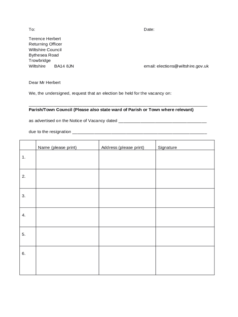 The To: Date: Terence Herbert Returning Officer Wiltshire ... is a writable document required to be submitted to the required address to provide certain info. It must be filled-out and signed, which is possible in hard copy, or by using a particular software e. g. PDFfiller. This tool allows to fill out any PDF or Word document right in the web, customize it according to your requirements and put a legally-binding electronic signature. Right after completion, user can send the To: Date: Terence Herbert Returning Officer Wiltshire ... to the appropriate receiver, or multiple individuals via email or fax. The editable template is printable too from PDFfiller feature and options proposed for printing out adjustment. In both electronic and physical appearance, your form will have a clean and professional appearance. It's also possible to save it as the template for later, there's no need to create a new blank form over and over. All that needed is to customize the ready sample.